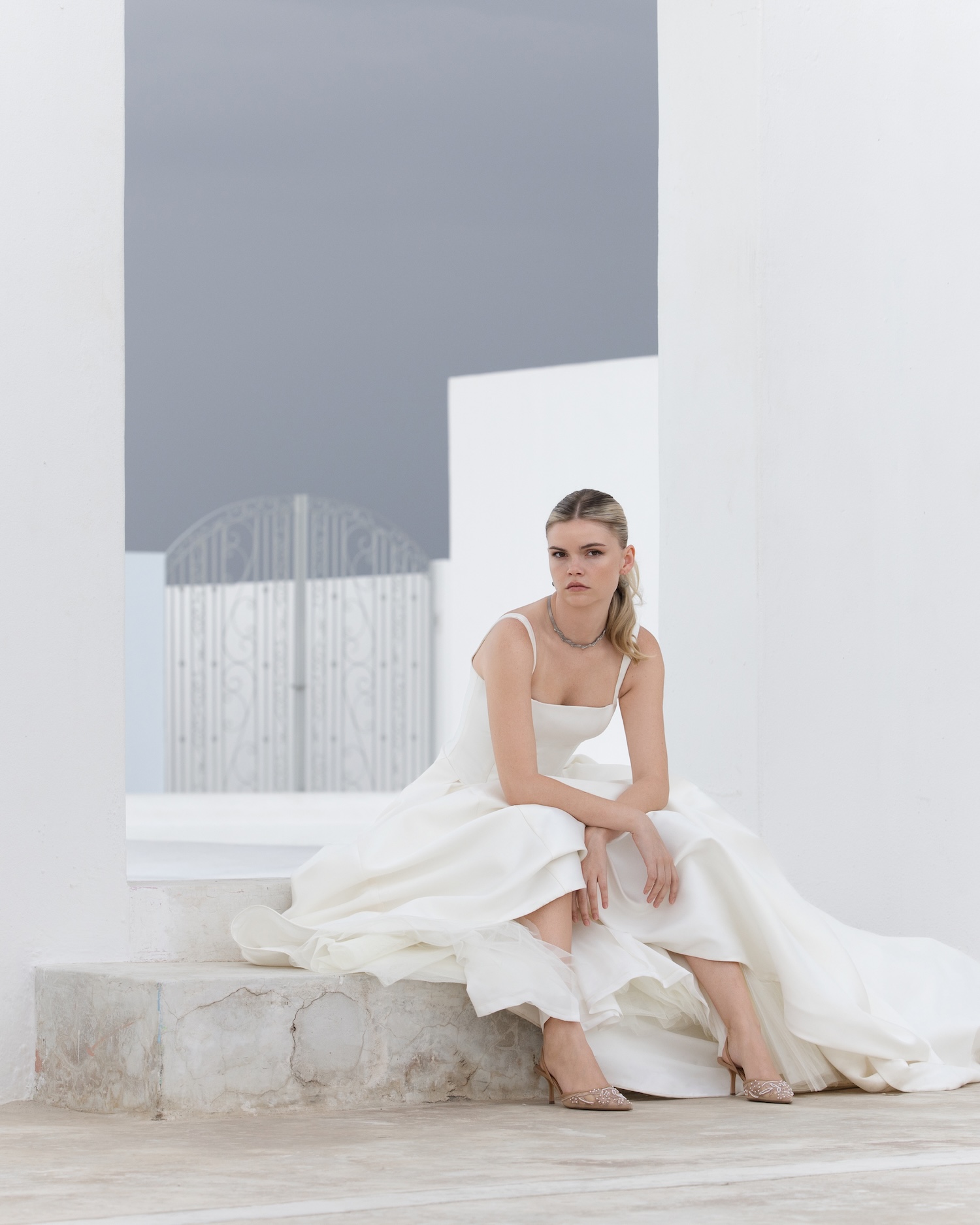 Isabella is a show-stopping mikado gown with a dramatic silhouette and modern square neckline. The Basque waist dips elegantly at the front, while layered folds and structured fabric create a striking flare at the hips.